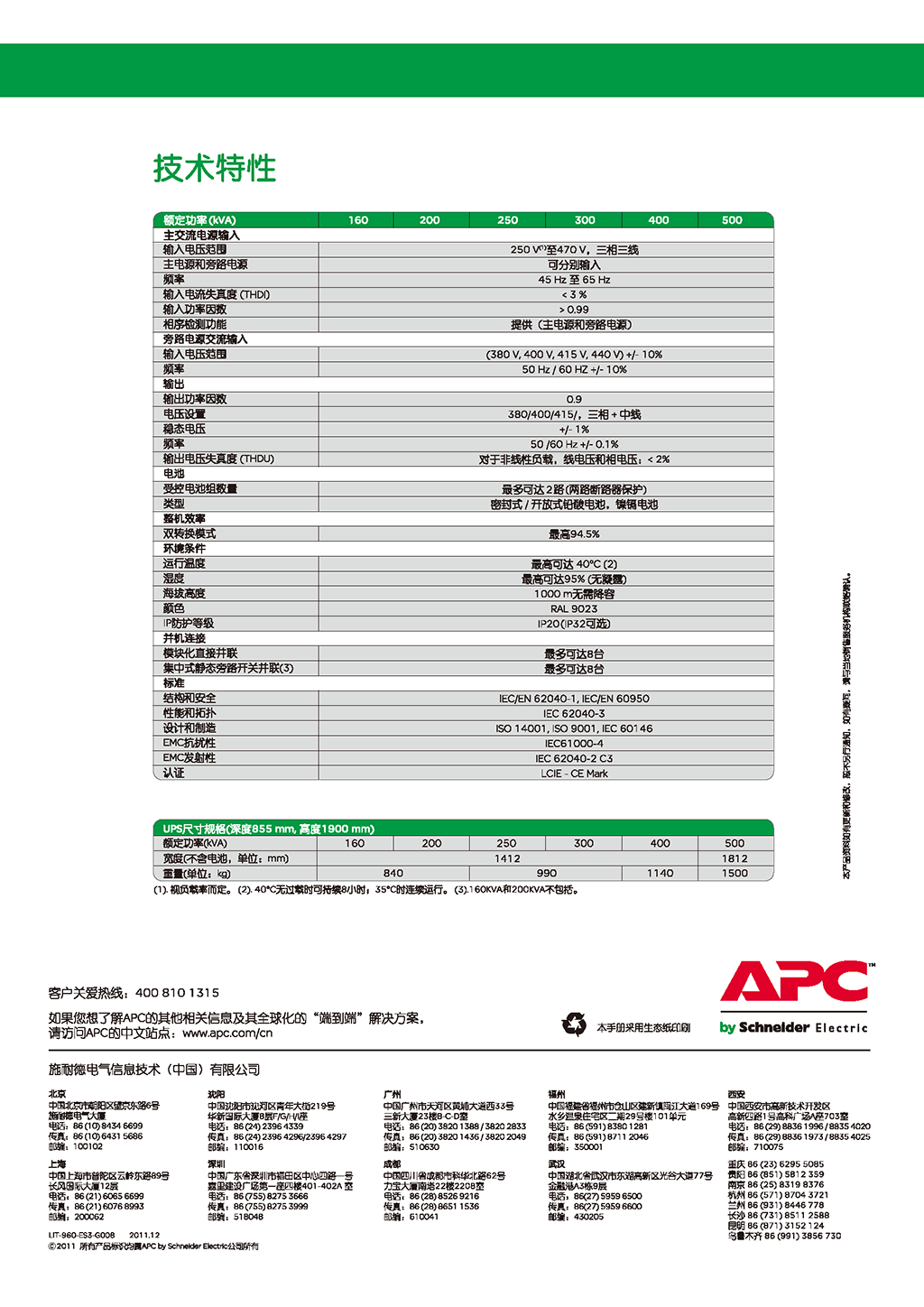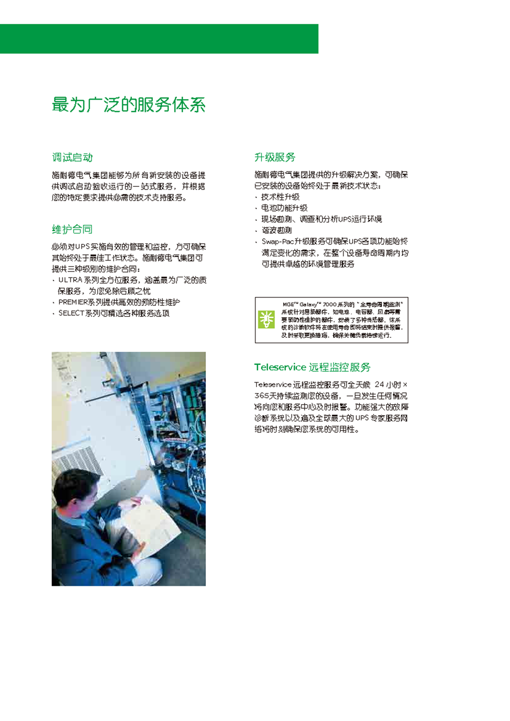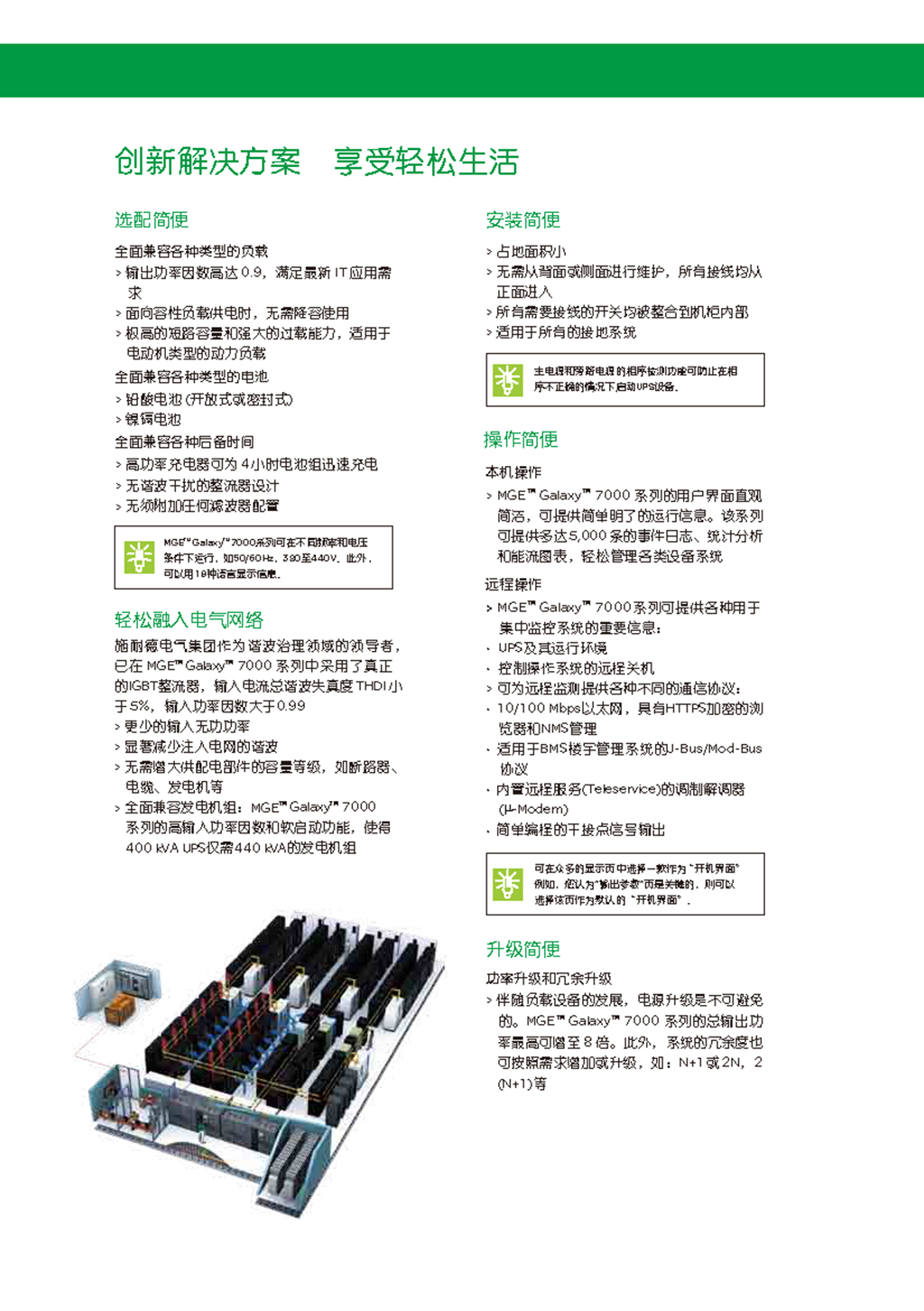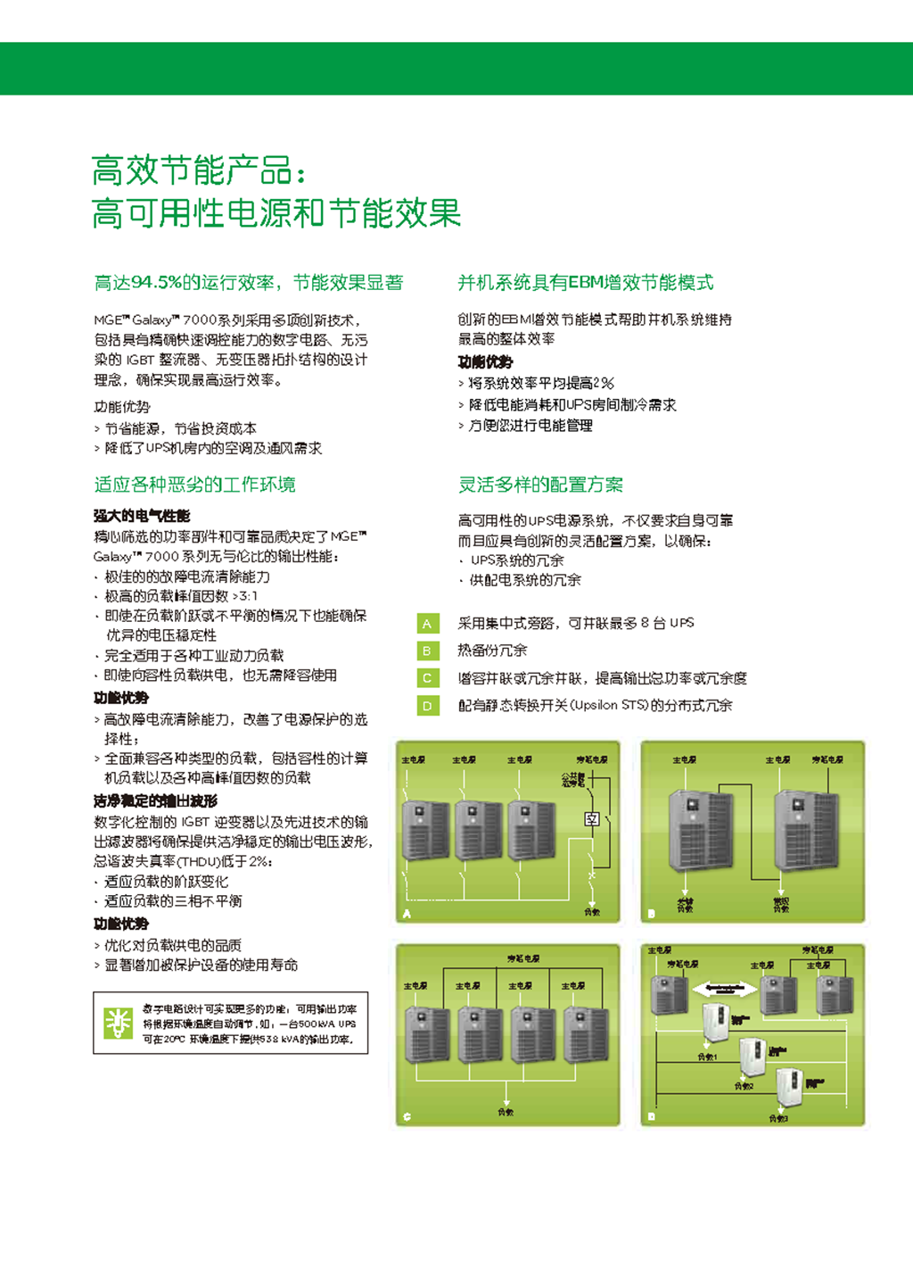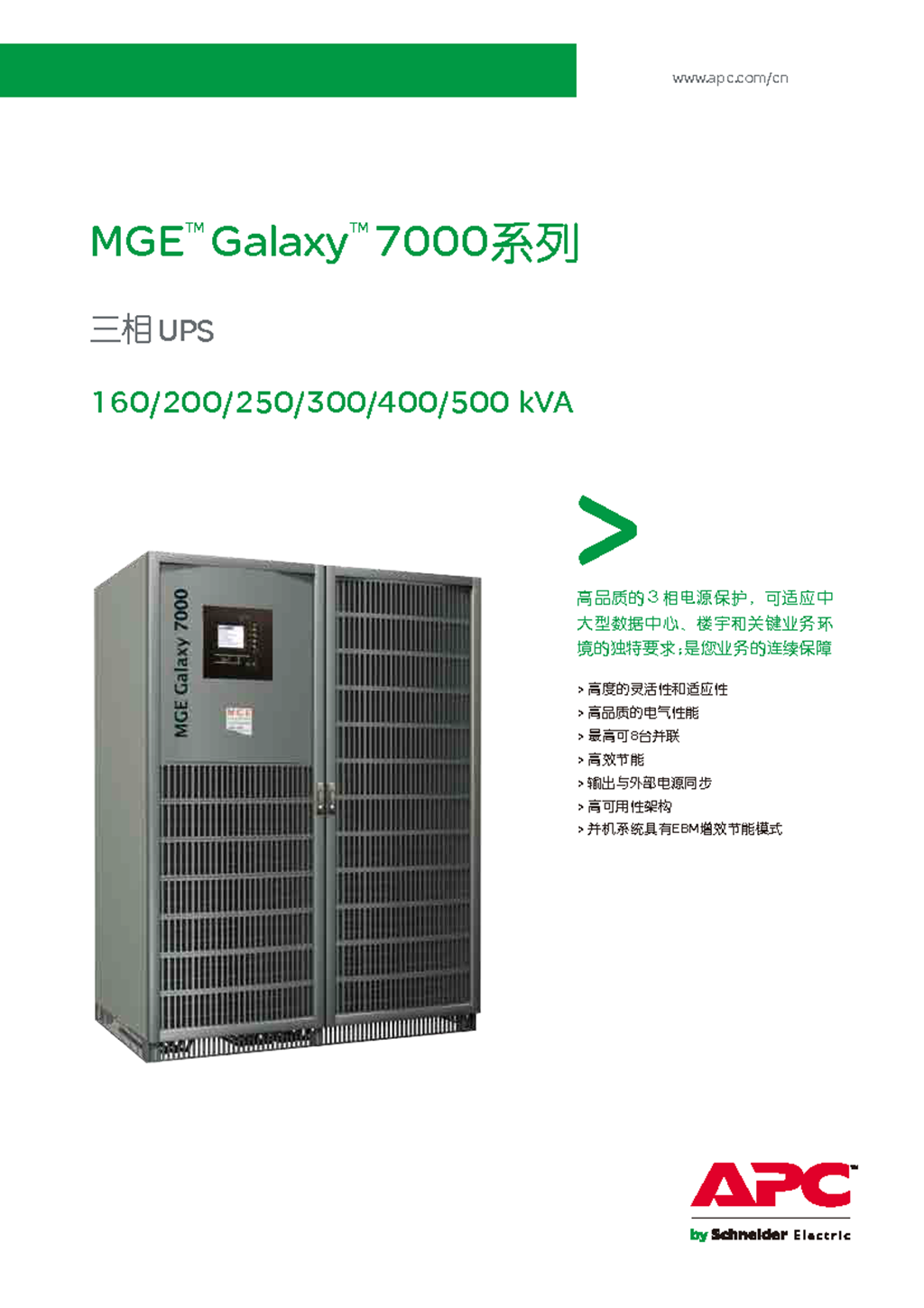 MGE Galaxy 7000是最新加入Galaxy UPS系列的成员,能够为大中型数据中心、工业、楼宇、任务关键型和海滨连接环境提供安全的电源解决方案。凭借其坚固耐用的IGBT整流器/逆变器设计,Galaxy 7000具有灵活、适应性强的特点,能够与任何类型的负载(电感性、电容性)一起工作。这种基于无变压器UPS的系统能够使系统效率最高可达94.5%,并使宝贵的运营成本保持在低位(节能),同时能够为任务关键型负载提供最高的电能质量。除了其高效率的特点之外,Galaxy 7000也可为单个和并联系统提供效率最高可达99%的ECO模式,还可为并联装置提供效率增强器模式(Efficiency Booster Mode),从而有助于节省更多的能量。Galaxy 7000包括像N+1并联/冗余模块等特性,且具有几个选项,例如:隔离式冗余特性、集成式并联特性、集中式静态开关等,再加上无需其它负载组就可帮助降低整体系统的成本的智能电力测试特性(SPoT),从而使得Galaxy 7000成为具有高可用性的适用于任务关键型环境的领先型UPS。易于安装和维护是这种新型UPS的核心设计的基础,仅需从前面进行电气连接,所有元件均为坚固耐用型。Galaxy 7000包括其它的UPS解决方案,例如:总线同步箱、IP32机柜、后馈保护、变频能力、以及包括VRLA、NiCad、外部匹配维护旁路柜和并联装置的具有灵活性、可扩展性的电池解决方案。通用型Galaxy 7000提供了与业界领先的通用通信协议的接口,且为了方便与大多数设备的连接而集成了SNMP、J-Bus/ModBus和RS485协议。Galaxy 7000可用的服务包括启动服务、预防性维护服务、快速响应服务和为一站式系统维护而设计的综合服务包。