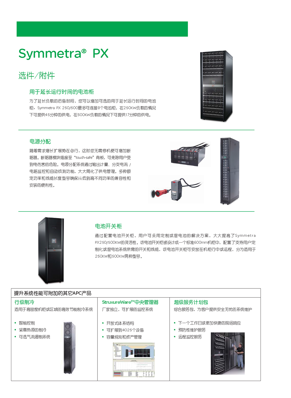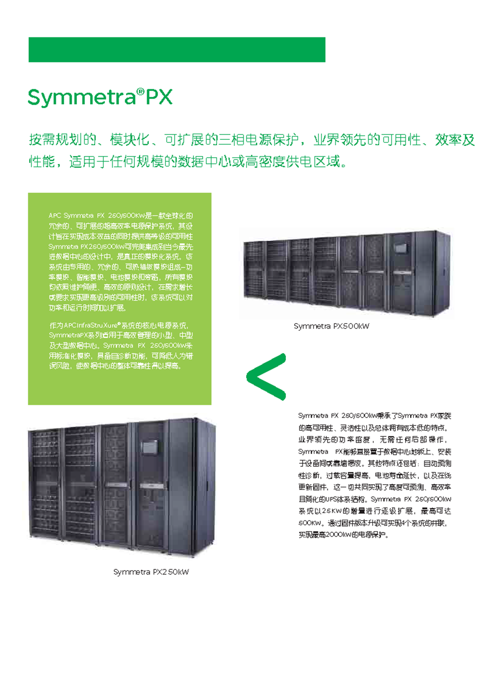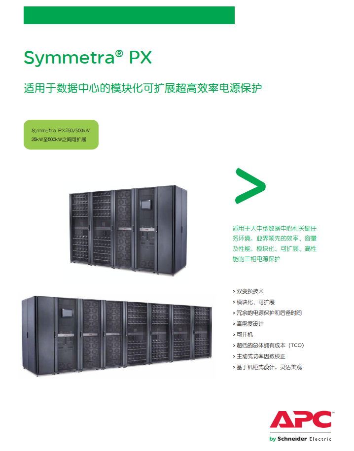 APC Symmetra PX 是世界一流的冗余可扩容电源保护系统,它经济有效,可用性高。Symmetra PX 与最新数据中心设计无缝集成,是一个真正的模块化系统。由专用的冗余模块组成 – 电源、智能模块、电池和旁路,全都设计为可方便有效地维修,这种架构可根据需求的增长或可用性级别的提高来扩展电源和运行时间。Symmetra PX 是驱动 APC InfraStruXure® 系统的核心电源系统,用于中小型数据中心,但也可为大型数据中心的单个“区域”供电。便于管理的 Symmetra PX 具有自诊断功能和标准化的模板,可减少人为错误,从而提高数据中心的总体可靠性。
