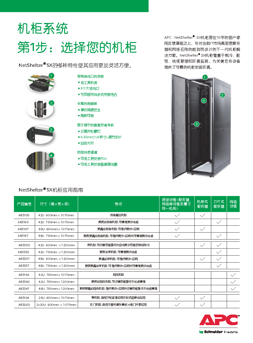 APC公司的NetShelter机柜是一款深受世界各地的客户反馈影响的多功能型机架安装式机柜。这些机柜被设计用于满足目前的IT市场发展趋势和从高密度计算和网络到广播和音频/视频等应用领域的要求。NetShelter机柜在制冷、配电、电缆管理和环境监测方面给予了重点关注,能够为任务关键型设备提供可靠的机架安装式环境。