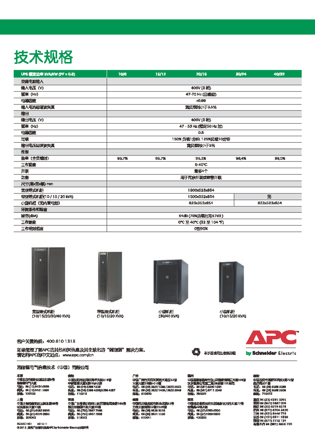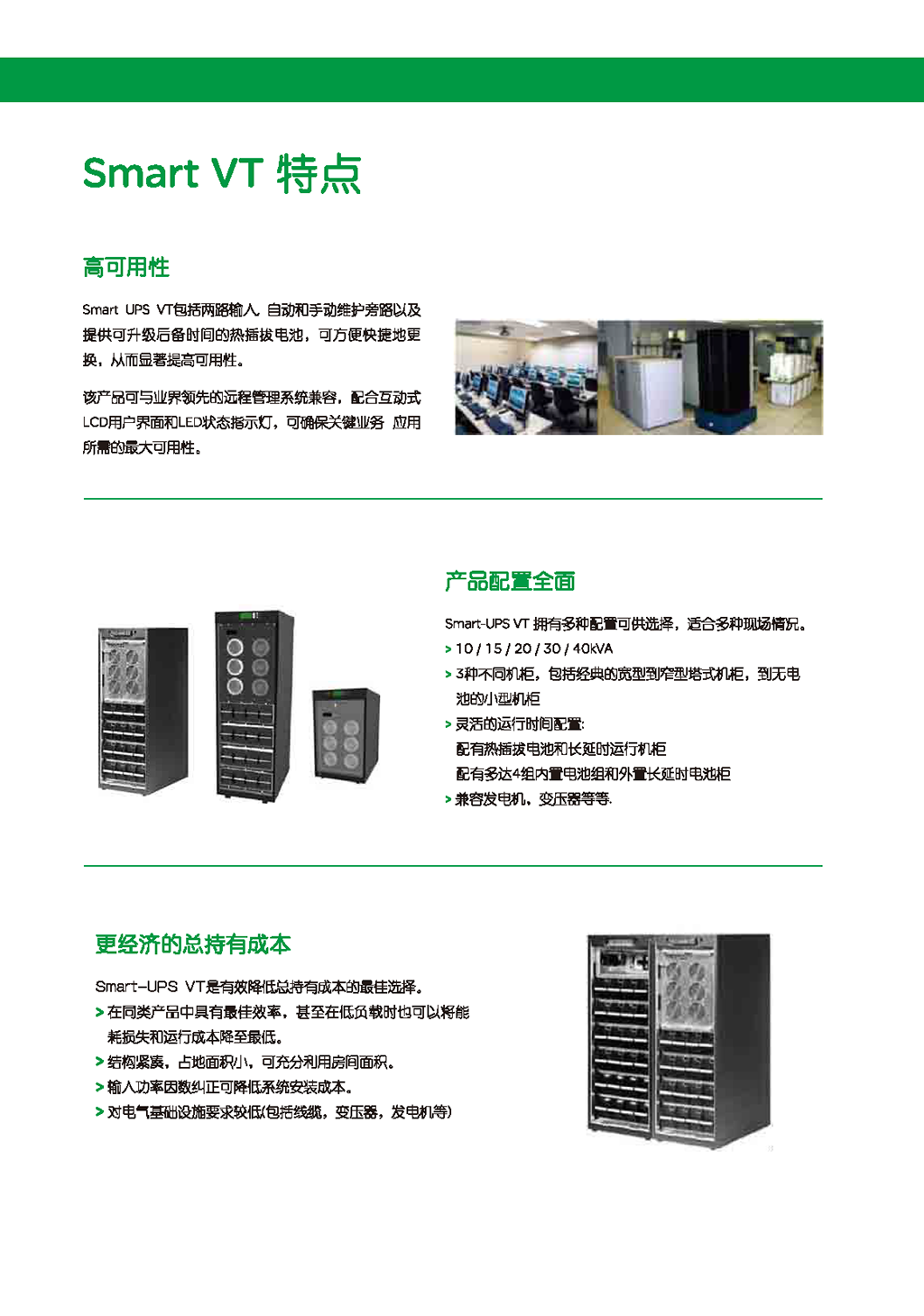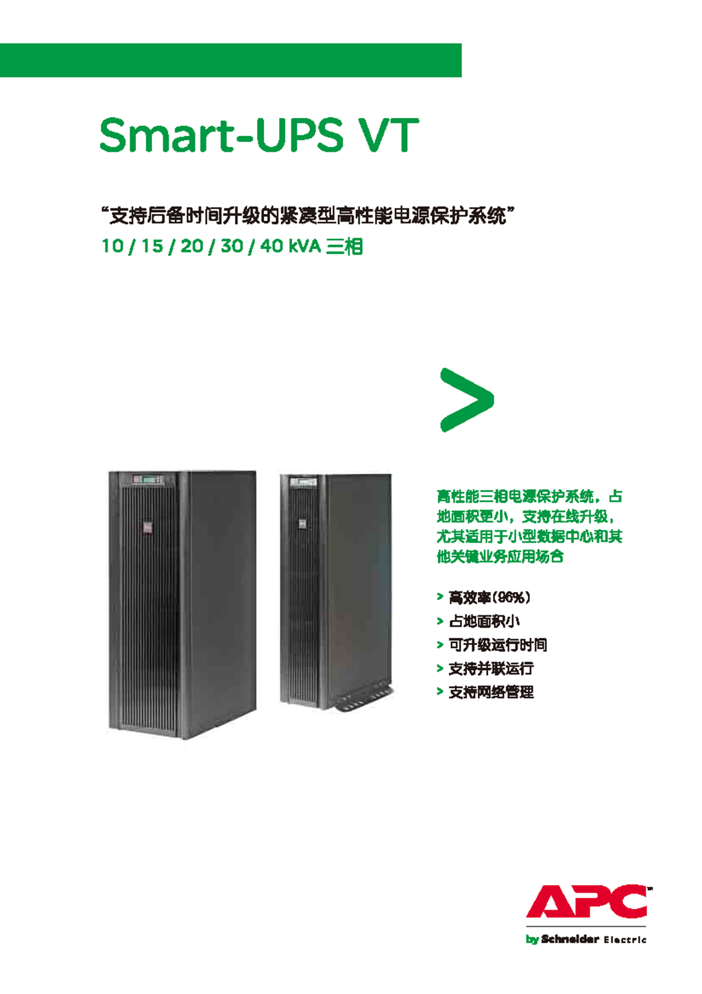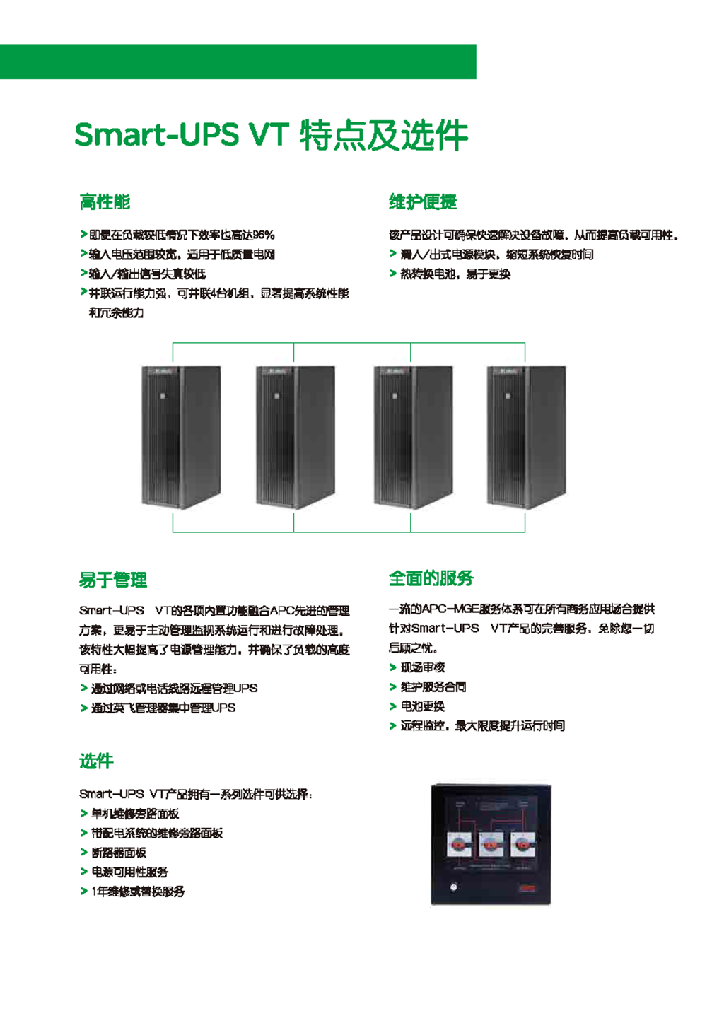 获奖的 Smart-UPS VT 系列产品具有高可靠性,可提供集中式三相电源保护。Smart-UPS VT 适用于小型数据中心、大型零售商店、地区办公室和高功率密度需求,其具有双市电输入、自动旁路和维护旁路及可扩展的运行时间,利用热插拔电池提高可用性。机架安装型将 UPS、配电和额外电池功能集成在一个机架中,从而充分利用地面空间。该设备在同一级别产品中具有最高效率,并且凭借着 Smart-UPS VT的软起动功能降低了对电力基础设施(电线、变压器和发电机)等级的要求,从而实现低拥有成本。带温度监控功能的 APC 网络管理卡可通过简单的 Web/SNMP 接口提供远程监控和管理,并可提供与 InfraStruXure 管理器的集成。通过用户可更换的电池、可管理的延长运行时间主机和起动及标准现场保修服务,大大提高了设备的可维护性。所有这些功能使得 Smart-UPS VT 成为同类产品中最易于部署、管理和维护的 UPS。