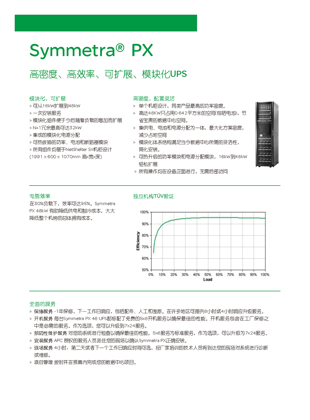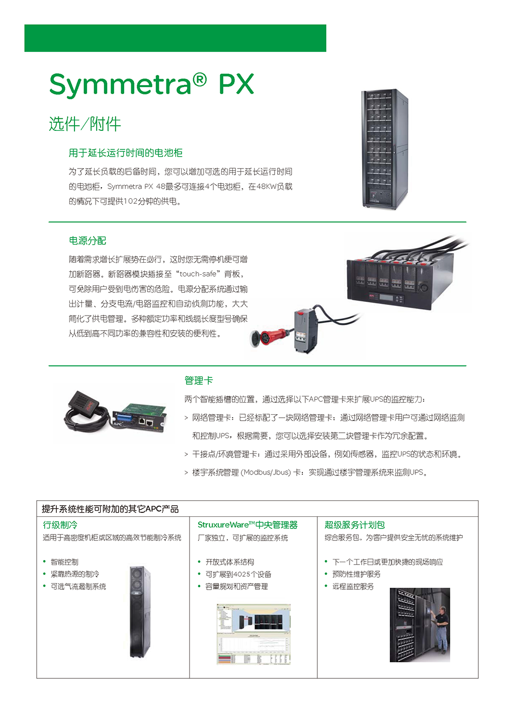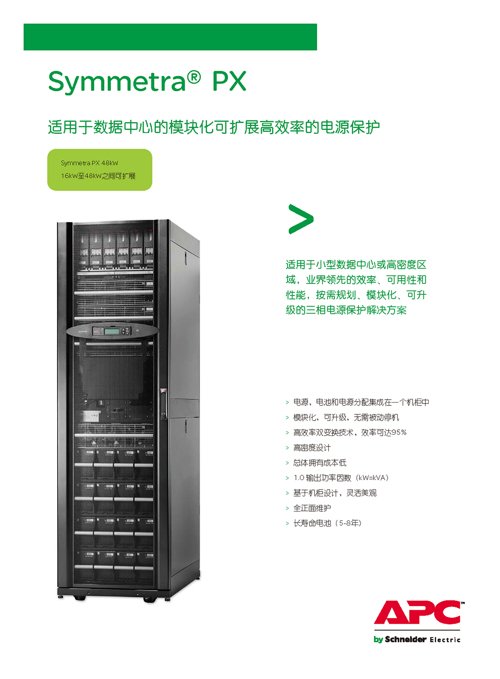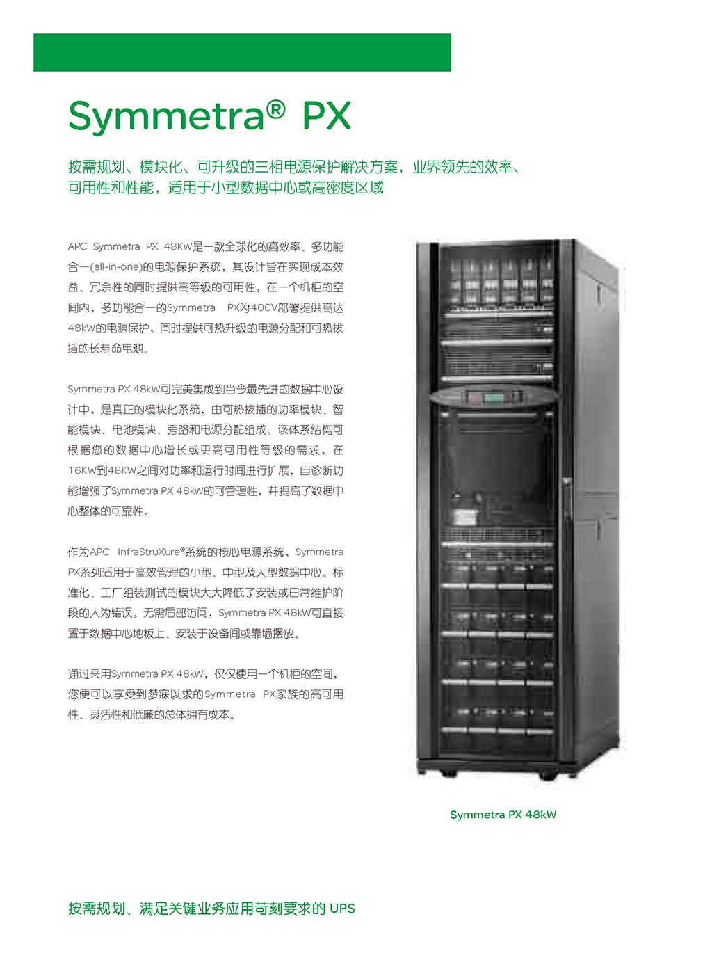APC Symmetra PX 是世界一流的冗余可扩容电源保护系统,它经济有效,可用性高。Symmetra PX 与最新数据中心设计无缝集成,是一个真正的模块化系统。由专用的冗余模块组成 – 电源、智能模块、电池和旁路,全都设计为可方便有效地维修,这种架构可根据需求的增长或可用性级别的提高来扩展电源和运行时间。Symmetra PX 是驱动 APC InfraStruXure® 系统的核心电源系统,用于中小型数据中心,但也可为大型数据中心的单个“区域”供电。便于管理的 Symmetra PX 具有自诊断功能和标准化的模板,可减少人为错误,从而提高数据中心的总体可靠性。