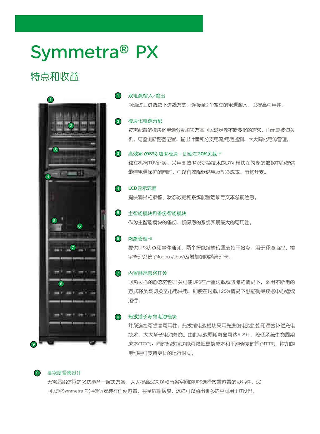 高性能、大小适中、模块化、可进行热升级、具有超高可用性和效率的3相电源保护,适用于任何规模的数据中心或高功率密度区。