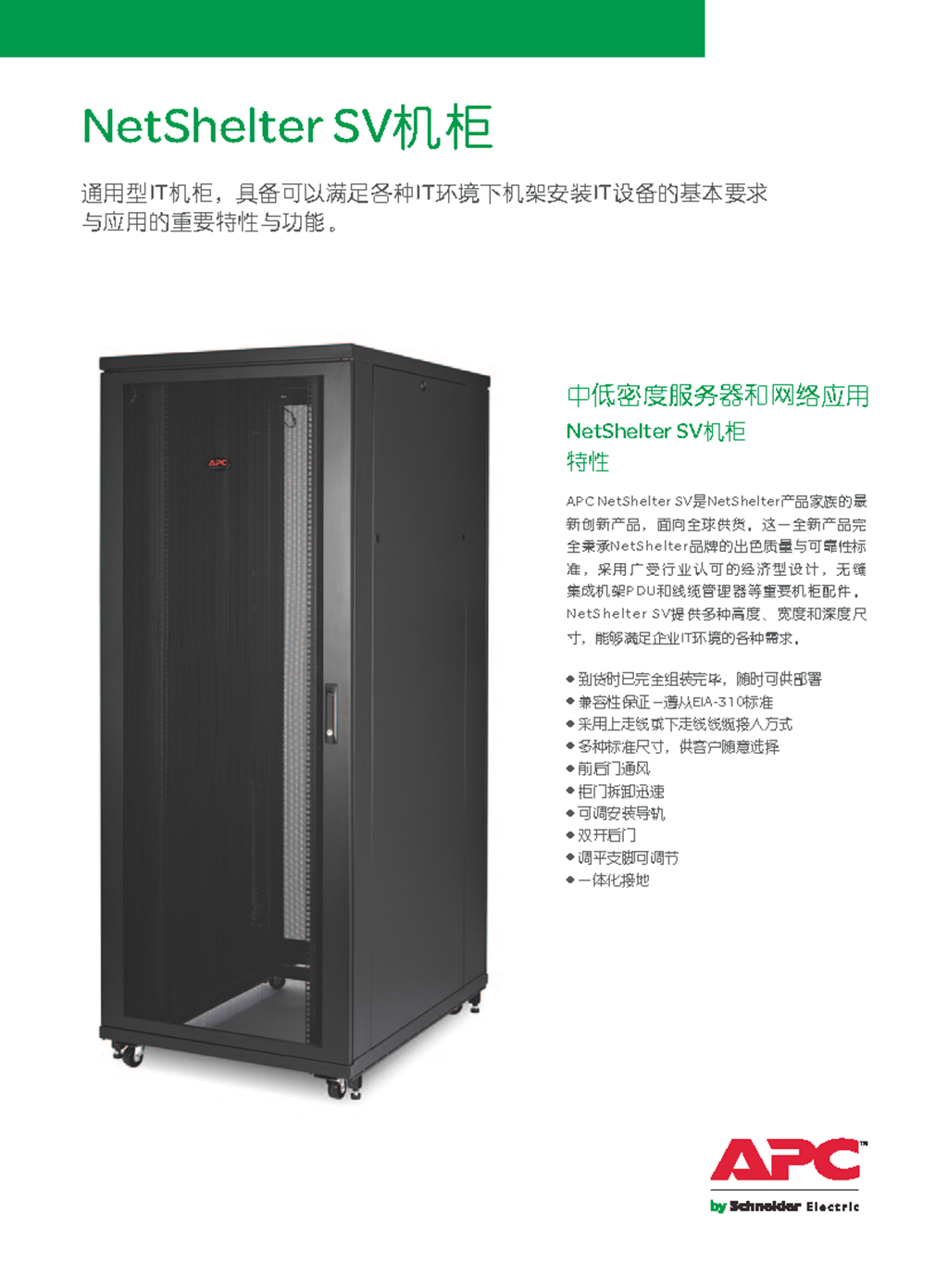 NetShelter SV是您已经熟悉的来自施耐德电气的IT机柜,但现在提供了基本功能和部件来作为一个具有成本效益的解决方案。NetShelter SV保持对于制冷、配电,线缆管理的重点关注,可为任务关键型设备提供可靠的机架安装环境,但带有一些可以降低基本机柜的成本的可选部件,如侧面板、脚轮、后部线缆通道等。